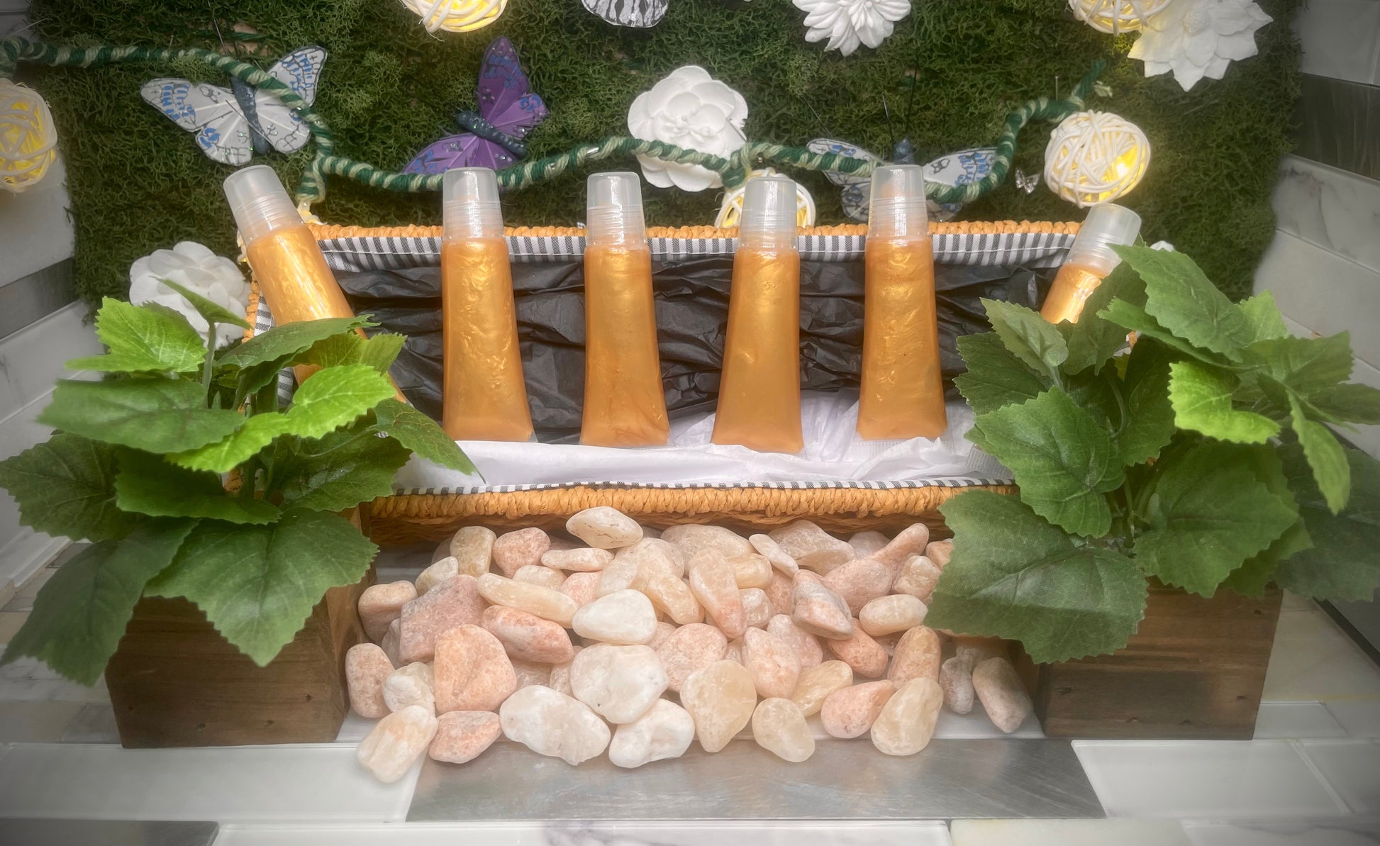 Jazzie Lip Gloss is a hand made lip gloss created for women to enjoy a lip gloss thats not sticky, makes your lips feel soft and finishes with a little gold shimmer with ingredients that includes: Base lip gloss, color, Aloe Vera,Vit E & Eucalyptus Essential oil. This combination creates a nonstick, moisturizing lip balm that is not greasy but soft and smooth