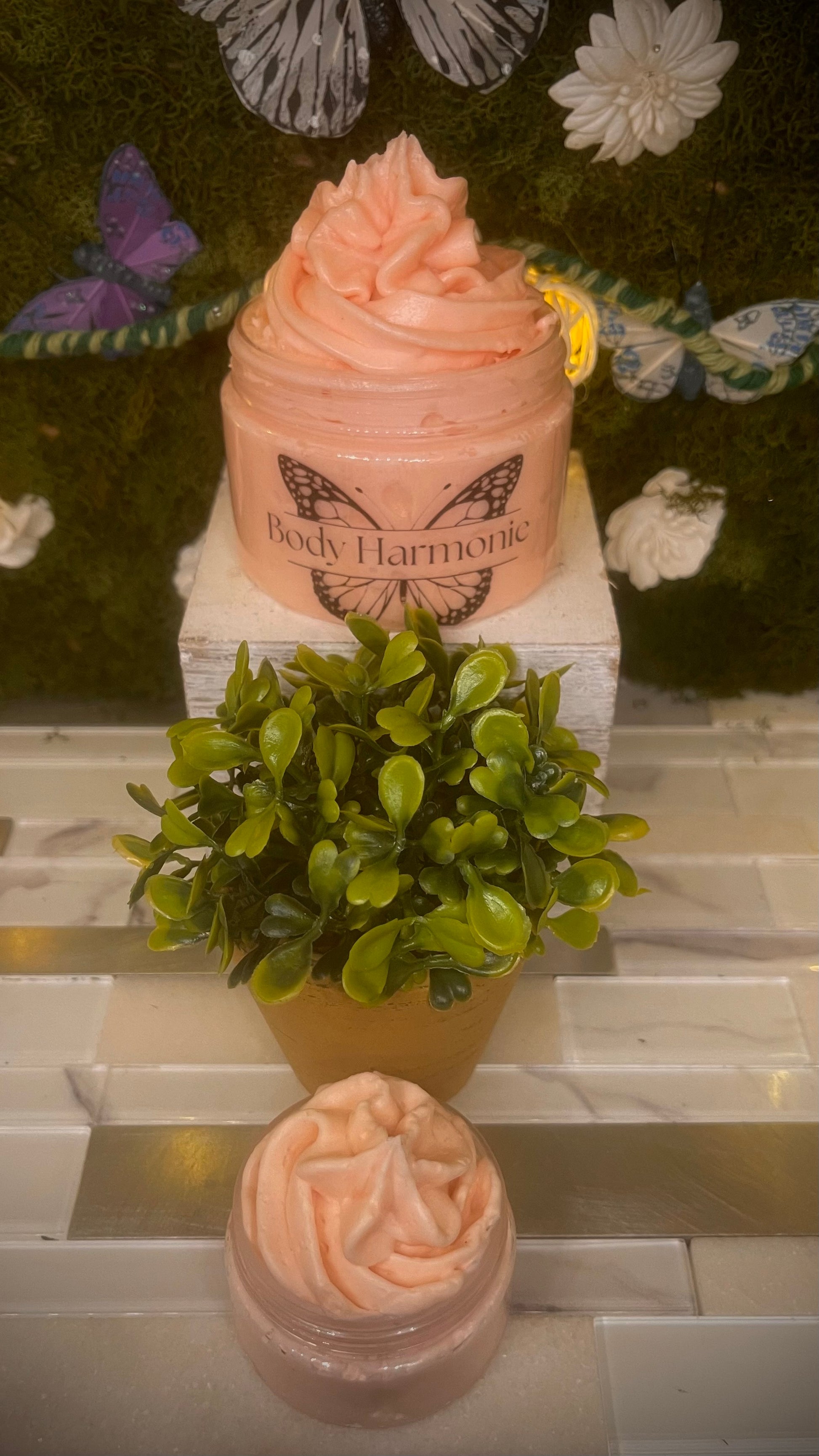 Himalayan Fusion is a hand made body butter with ingredients that include: Shea butter, Coconut, Sweet Almond, Vit E & Aloe Vera oil, Arrow Root, Eucalyptus & Frankincense essential oil, Fragrance & color. Theses ingredients combined soften and tighten skin, reduce pain, help with inflammation, anxiety, reduce stress, eczema, stiffness, relieve muscle pain, etc... This product is created for relaxing, softening and healing your beautiful skin.